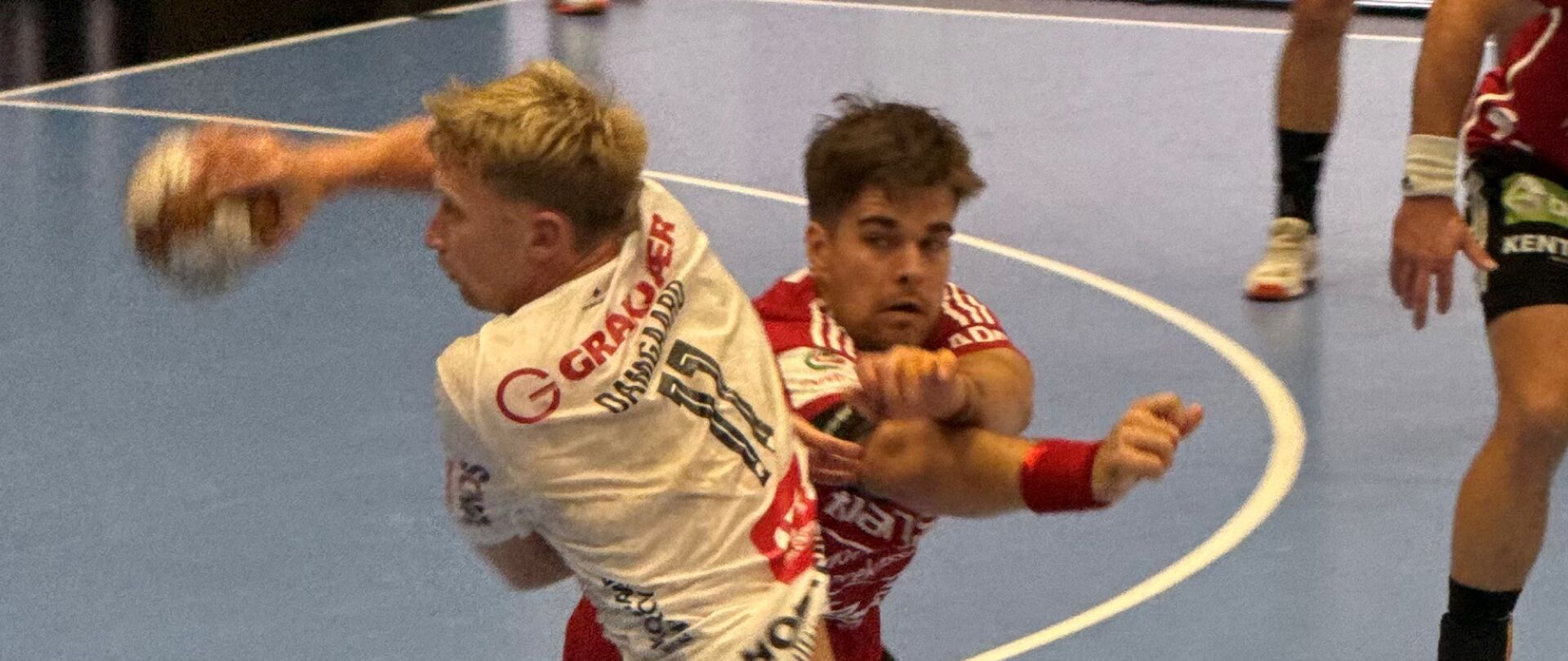Det blev en udekamp med alt, hvad den slags kan indeholde – både på og uden for banen. Allerede fra første fløjt blev der lagt tryk på fra lægterne, men TTH Holstebro håndterede presset flot og kom godt fra start. Holdet gik til pause med en fortjent føring på 16–17 efter stærkt spil i begge ender.